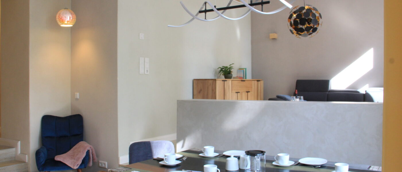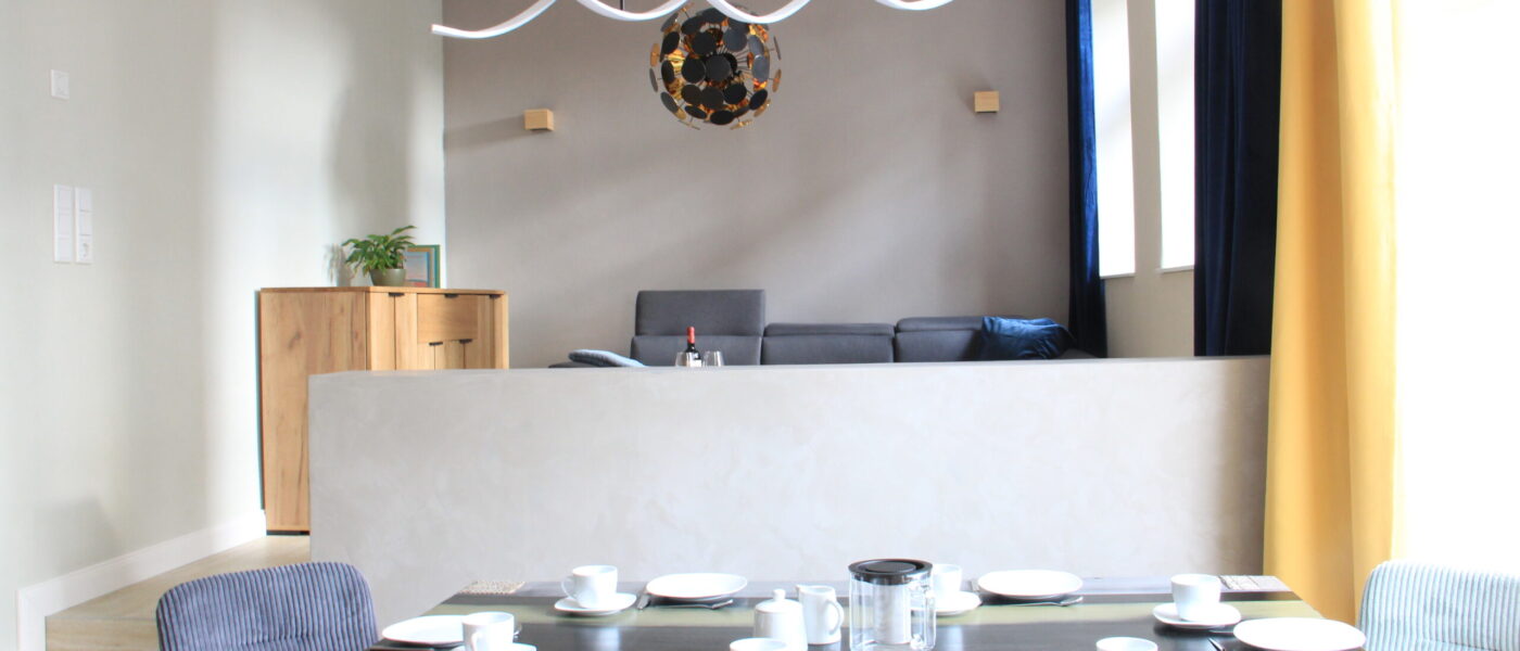 Herzlich willkommen in unserem hochwertig ausgestatteten, neu saniertem „Quartier der Moderne“ im charmantem Altbau in Weimar. Die familienfreundliche und geschmackvoll eingrichtete Ferienwohnung mit separatem Eingang bietet Platz für bis zu 6 Personen. Sie verbindet historischen Charme mit modernem Komfort. Das gemütliche Wohnzimmer lädt mit einem komfortablen Schlafsofa (ca. 140 x 200 cm für maximal 2 Personen) und einem Flachbild-TV zum Entspannen ein. Kostenloses W-Lan steht unseren Gästen während ihres Aufenthalts zu Verfügung. Die geräumige, komplett ausgestattete Wohnküche bietet Platz für gemeinsame Mahlzeiten und gesellige Abende. Die Wohnung verfügt über zwei Schlafzimmer mit jeweils einem Doppelbett (160 x 200cm, 180 x 200cm) sowie einem Flat-TV in einem der Schlafzimmer. Die Schlafzimmer liegen im hinteren Teil der Wohnung und sorgen für einen ruhigen und erholsamen Schlaf. Das stilvolle Bad ist mit einer Badewanne, einer bodenebenen Dusche und kostenlosen Pflegeprodukten ausgestattet. Für ein angenehmes und frisches Raumklima sorgen die Fußbodenheizung sowie eine Lüftungsanlage mit permanenter Frischluftzufuhr. Für unseren kleinen Gäste kann kostenfrei ein Reisekinderbett und ein Hochstuhl bereitgestellt werden. Spiele und Bücher sorgen für Unterhaltung.